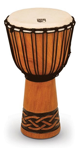 diameter shell is hand-lathed from higher grade portions of environmentally-friendly, plantation-grown mahogany logs Hand-lathed shells are crafted in traditional dimensions with uniform shell thickness while the bowl interior is left grooved and rough-surfaced to eliminate unpleasant overtones while retaining a rich timbre | Hand-selected goatskin heads and high tensile braided nylon rope